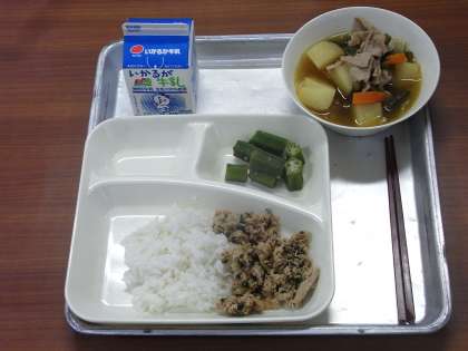 7月15日(水)、今日の給食のメニューは、「ごはん、豚肉とじゃがいもの煮もの、オクラの梅風味、ツナっ葉いため、牛乳」でした。
