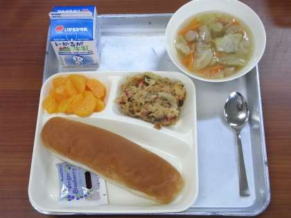 7月16日(木)の給食のメニューは、「コッペパン・ブルーベリージャム・パエリア・ウインナーとキャベツのスープ・みかん(缶)・牛乳」でした。