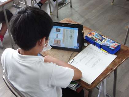 4年生では、タブレット端末にインストールされているコンテンツ「発表ノート」を使って、新聞を作りました