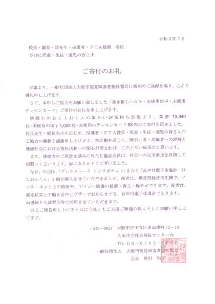 大阪市視覚障害者福祉協会より、「書き損じハガキ・未使用切手・未使用テレホンカード」寄付に対してのお礼の文書をいただきました。保護者の皆さまには、ご協力いただきありがとうございました。