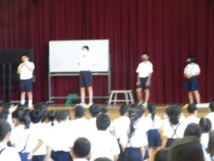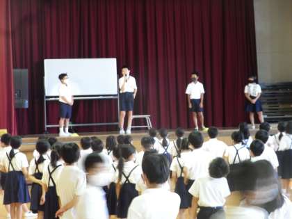 8月31日(月)の児童集会では、ジェスチャークイズをしました。集会委員がしている動きから、何をしているところなのかを考えました。