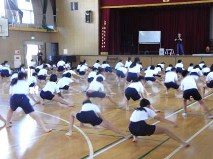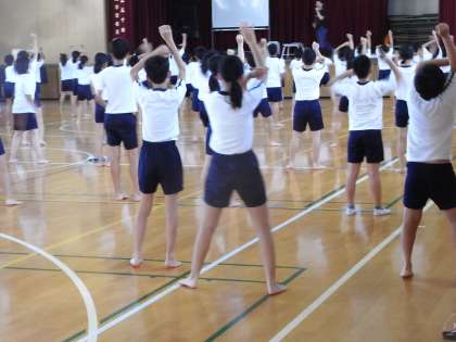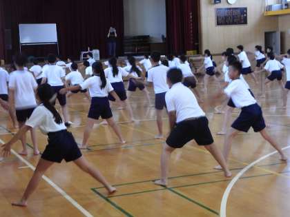 暑い最中ですが、各学年とも早速運動発表会の練習が始まっています。6年生は、団体演技で踊る「南中ソーラン」を練習しました。