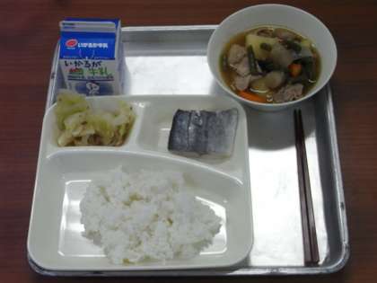 9月3日(木)、今日の給食のメニューは、「ごはん、さごしの塩焼き、豚肉とじゃがいもの煮もの、キャベツの梅風味、牛乳」でした。