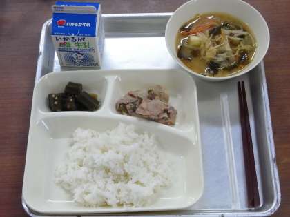 9月8日(火)、今日の給食のメニューは、「ごはん、豚肉の甘辛焼き、みそ汁、オクラのおかかいため、牛乳」でした。