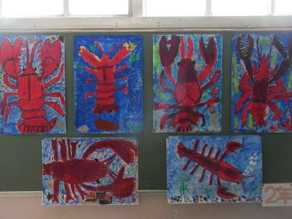2年生は、毎日世話をしているザリガニを、パスを使って形や色をよく見ながら、画用紙いっぱいに描きました。迫力満点です!