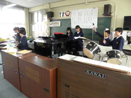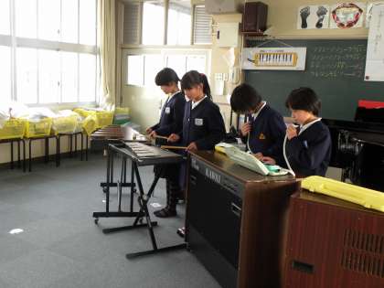 明日の音楽集会にむけて、放送委員会の人たちが給食時間中に放送するためのビデオを作成しました。放送委員の有志が集まって「赤鼻のトナカイ」を合奏しました。
