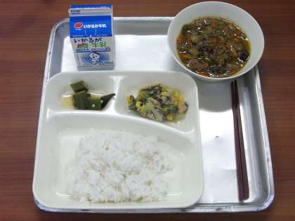 9月15日(火)、今日の給食のメニューは、「ごはん、マーボーなす、オクラの甘酢あえ、ツナとチンゲンサイのいためもの、牛乳」でした。