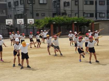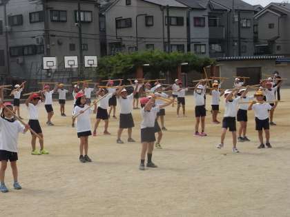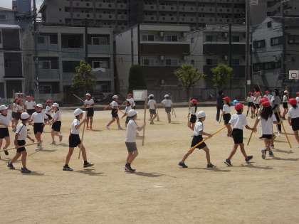 9月15日(火)、4年生の団体演技の練習です。棒を使って頑張って踊ります。