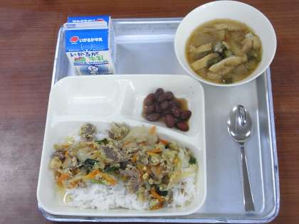 9月18日(金)、今日の給食のメニューは、「他人丼、とうがんのみそ汁、金時豆の煮もの、牛乳」でした。