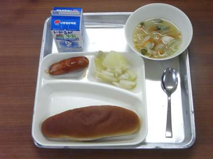9月23日(水)の給食のメニューは、「黒糖パン、フランクフルトのケチャップソース、スープ、焼きじゃが、牛乳」でした。