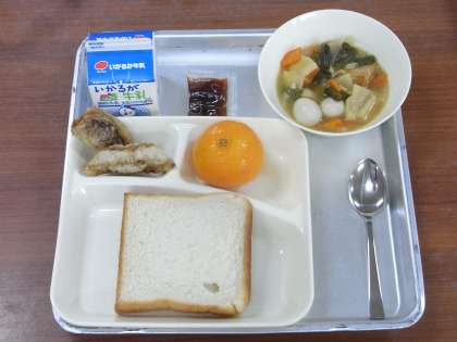 9月30日(水)、今日の給食のメニューは、「食パン、いちごジャム、あげぎょうざ、中華煮、冷凍みかん、牛乳」でした。