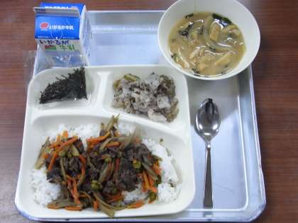 10月8日(木)の給食のメニューは、「牛肉のきんぴらちらし、みそ汁、キャベツの赤じそあえ、牛乳」でした。