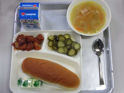 10月9日(金)、今日の給食のメニューは、「コッペパン、ソフトマーガリン、まぐろのオーロラ煮、ベーコンとじゃがいものスープ、きゅうりとコーンのゆずドレッシング、牛乳」でした。