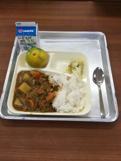 10月13日(火)の給食のメニューは、「ポークカレーライス、はくさいのピクルス、みかん、牛乳」でした。