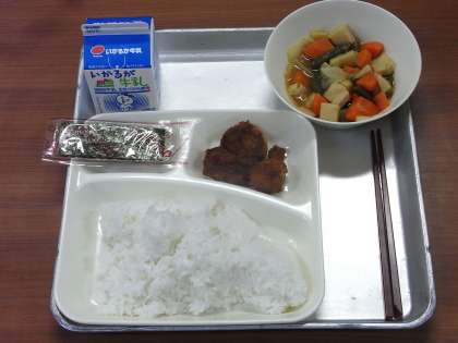 10月19日(月)の給食のメニューは、「ごはん、みそカツ、じゃがいもと野菜の煮もの、焼きのり、牛乳」でした。