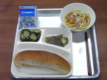 10月23日(金)、今日の給食のメニューは、「ライ麦パン、牛肉のカレー風味焼き、ほたて貝とトマトのスープスパゲッティ、きゅうりのサラダ、牛乳」でした。