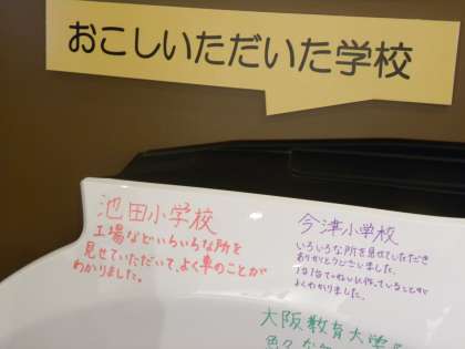 工場見学へのお礼の言葉を4組学級代表の宇田川さんが5年生の代表として掲示板に書きました。「1台1台ていねいにつくられていることがわかりました」しっかり見学できた言葉でした。
