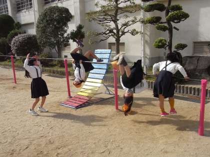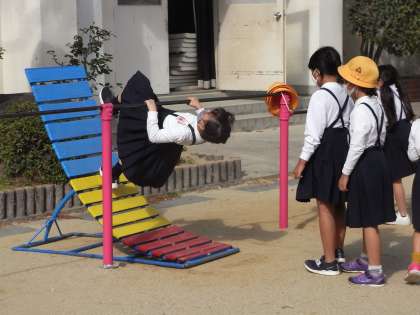 これまで青色一色だった鉄棒の支柱や逆上がり補助板ですが、このたび鉄棒の支柱を青・黄・桃の3色に、逆上がり補助板を青・黄・赤の3色に、それぞれ塗装しなおしました。とても明るい雰囲気に様変わりです。