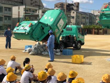 4年生の子どもたちは、大阪市環境局の方に来ていただき、パッカー車の学習をしました。ゴミ収集時の音楽を聞いたり、実際にパッカー車を動かしてもらったりしました。ふだんは、見ることができない、パッカー車の中も見せてもらいました。