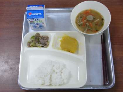 11月11日(水)、今日の給食のメニューは、「ごはん、豚肉とまいたけのいためもの、つみれ汁、かぼちゃういろう、牛乳」でした。