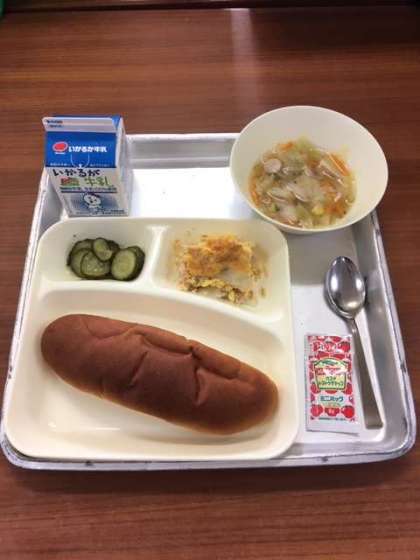 11月12日(木)、今日の給食のメニューは、「黒糖パン、ツナポテトオムレツ、スープ、きゅうりのバジル風味サラダ、牛乳」でした。