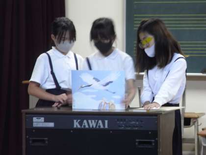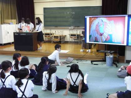 11月19日(木)、読書週間の3日目です。図書委員が絵本を読みながら、大型テレビを使って紙芝居をしました。