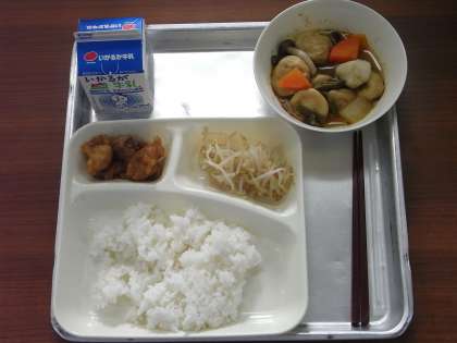 11月26日(木)、今日の給食のメニューは、「ごはん、あげどりのねぎだれかけ、含め煮、もやしのピリ辛あえ、牛乳」でした。