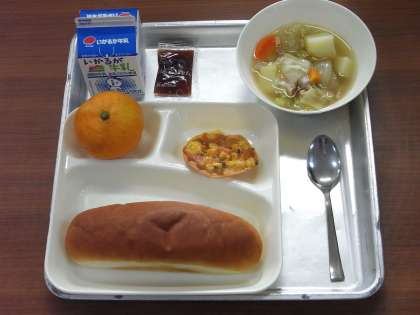 11月27日(金)、今日の給食のメニューは、「コッペパン、いちごジャム、豚肉と野菜のスープ煮、変わりピザ、みかん、牛乳」でした。
