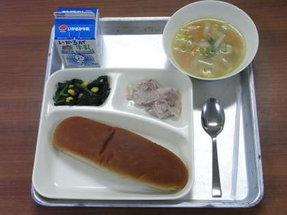 12月1日(火)、今日の給食のメニューは、「黒糖パン、豚肉のガーリック焼き、スープ、ほうれん草のソテー、牛乳」でした。