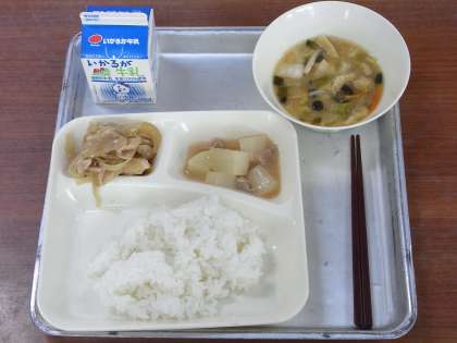 12月3日(木)の給食のメニューは、「ごはん、鶏肉の甘辛焼き、みそ汁、だいこんの煮もの、牛乳」でした。