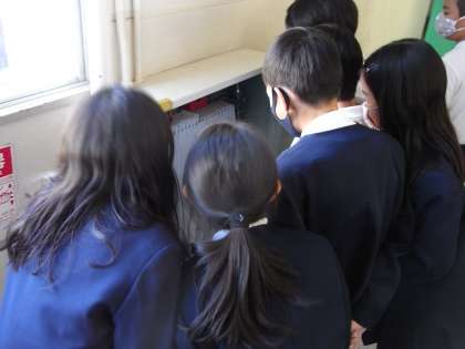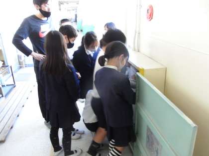 12月4日(金)、3年生は社会科の学習で、学校や町には、防火扉・消火器・火災報知器・消火栓・防火水槽などの消防設備があることを学習しました。また、廊下にある消火栓を実際に確かめました。