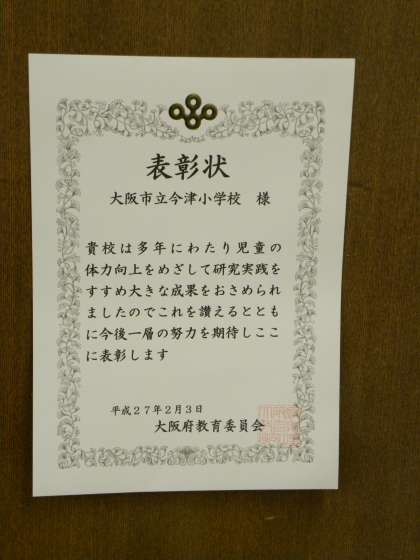 今津小は大阪府教育委員会より「体力づくり優良校」に表彰されました。表彰式に校長が出席し賞状をいただいてきました。