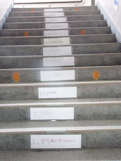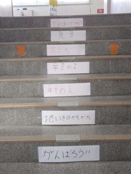 代表委員会では、校内でのあいさつがもっともっと活発になるように、あいさつの標語を階段に貼りました。