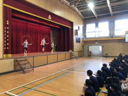 土曜授業として、なわとびの出前授業を行いました。講師の方3人に来ていただき、さまざまな技を見せていただきました。曲に合わせて、なわとびを跳んでくれました。短縄やビーズロープで一人技、二人技を見せてくれました。また、ダブルダッチも見せてくれました。中でも、一人技での「5重跳び」、二人技での「チャイニーズホーイール」などの技が、ふだん見れないもので、子どもたちも驚きでした。最後に、担任の先生にも参加してもらった「トラベラー」という技は、みんなで楽しく、簡単にできるので大盛り上がりでした。