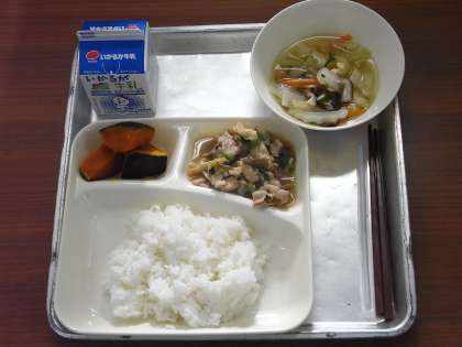 12月17日(木)、今日の給食のメニューは、「ごはん、豚肉と干しずいきのみそ煮、すまし汁、焼きかぼちゃの甘みつかけ、牛乳」でした。