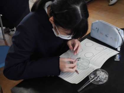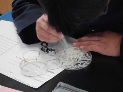 12月17日(木)、6年生は理科の学習で、ちりめんじゃこ(主にカタクチイワシの稚魚)の中に混じっているいろいろな生物(ちりめんモンスター)を探し出しました。カニのこどもやエビのこどもなど、たくさん混じっていました。