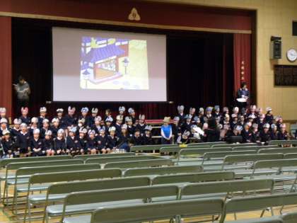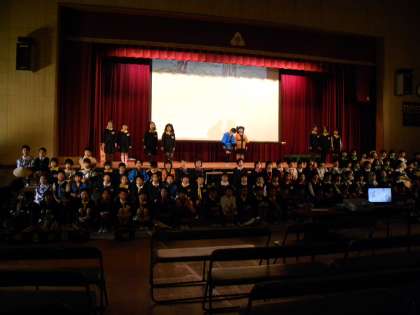 1年生は「おむすびころりん」の劇です。ダンスや合奏もあります。、今津小学校の校歌を手話でも歌います。
