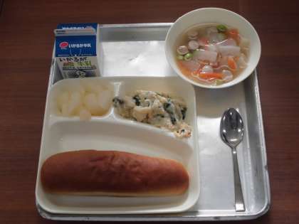 1月8日(金)、今日の給食のメニューは、「黒糖パン、ほたて貝のグラタン、スープ、和なし(カット缶)、牛乳」でした。とても寒い一日。スープで体が温まりました。