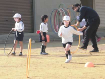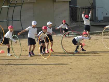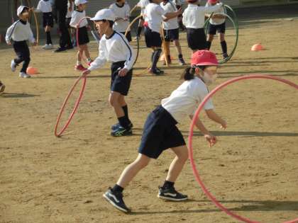 1月13日(水)、1年生は体育科の時間に、体つくりの運動遊びとして、フープを回したり、転がしたりしました。