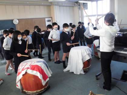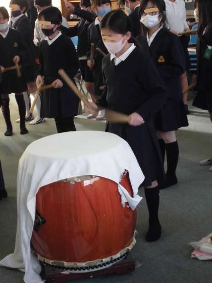 1月13日(水)、4年生は音楽科の時間に、和太鼓を使っていろいろなリズムを打ち、和太鼓の演奏を楽しむことができました。