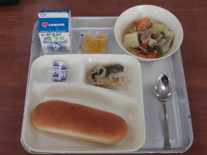 1月18日(月)、今日の給食のメニューは、「コッペパン、マーマレード、あじのレモンマリネ、てぼ豆のスープ煮、固形チーズ、牛乳」でした。