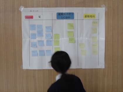 5年生は、一人で自宅にいる時、地震が起こったと想定して、「まずどうするのか」、「地震の揺れが収まってから避難場所まで行く途中どうするのか」、「避難場所で何ができるのか」を考えて、一人一人付箋に書いて模造紙に貼りました。