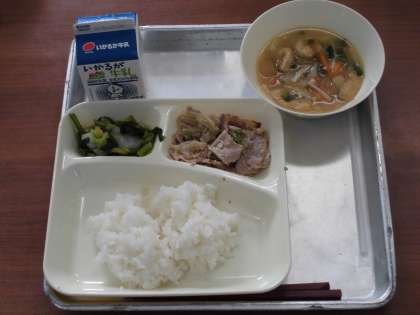 1月21日(木)、今日の給食のメニューは、「ごはん、豚肉のごまだれ焼き、みそ汁、きくなと白菜のおひたし、牛乳」でした。