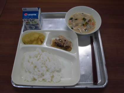 1月22日(金)、今日の給食のメニューは、「ごはん、鶏肉の甘辛焼き、かす汁、くりきんとん、牛乳」でした。