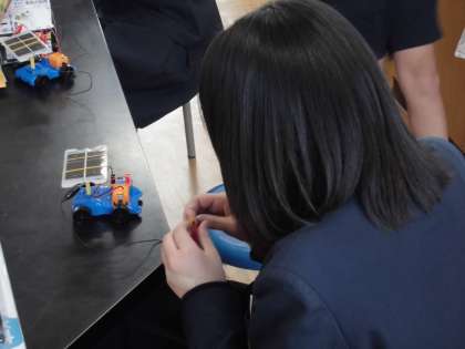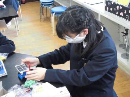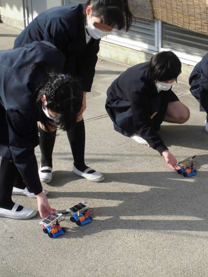 1月28日(木)、6年生は理科の学習で、光電池で電気を作り、作った電気を利用して車を走らせました。