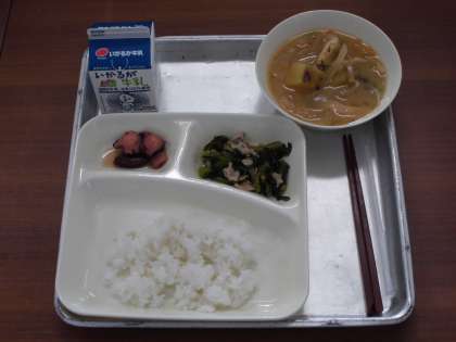 2月8日(月)、今日の給食のメニューは、「ごはん、泉だこのやわらか煮、みそ汁、こまつなの煮びたし、牛乳」でした。