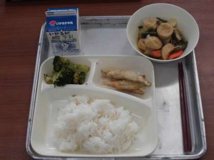 2月12日(金)の給食のメニューは、「ごはん、きびなごてんぷら、一口がんもとじゃがいもの煮物、ブロッコリーのごまあえ、牛乳」でした。