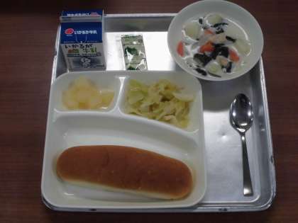 2月26日(金)の給食のメニューは、「コッペパン、マーガリン、ほうれん草のクリームシチュー、キャベツのサラダ、洋梨(缶詰)、牛乳」でした。