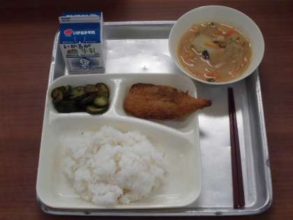 3月1日(月)の給食のメニューは、「ごはん、いわしのフライ、みそ汁、きゅうりの赤じそあえ、牛乳」でした。