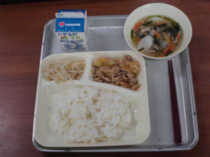 今日の給食のメニューは、「ごはん、豚肉のコチジャンいため、トック、もやしのナムル、牛乳」でした。